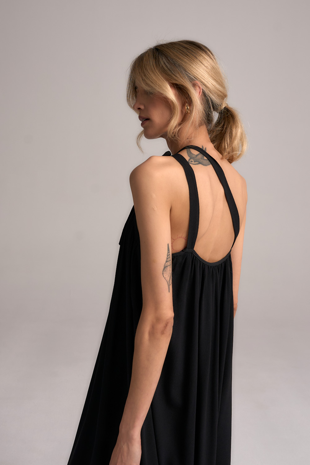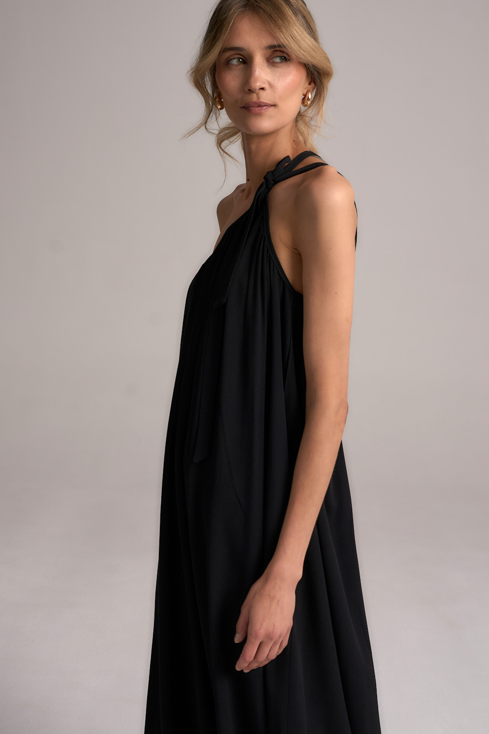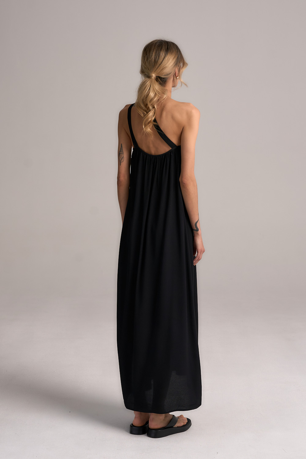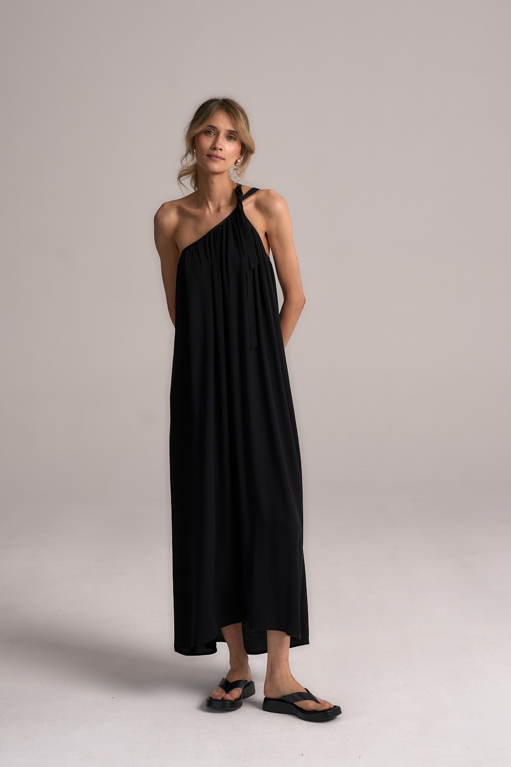 Długa sukienka o asymetrycznym kroju to propozycja dla miłośniczek minimalizmu i prostoty. Lekko poszerzana forma w kształcie trapezu zapewni wygodę i pełną swobodę podczas noszenia. Asymetryczny dekolt z łatwością możesz regulować za pomocą wiązanych ramiączek. Sukienka jest uszyta z opornej na gniecenie wiskozy o żorżetowym splocie w czarnym kolorze. Tkanina jest przewiewna, i lekka. Sukienka ma uniwersalny charakter, sprawdzi się na co dzień, podczas letnich dni w mieście czy podczas wakacyjnych podróży. Jesienią z łatwością wystylizujesz ją z ramoneską czy swetrem i paskiem.