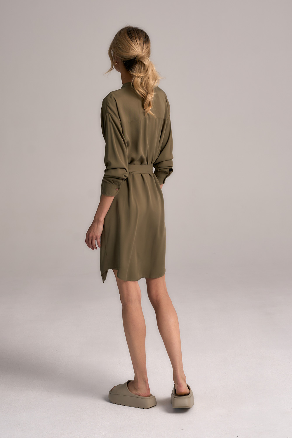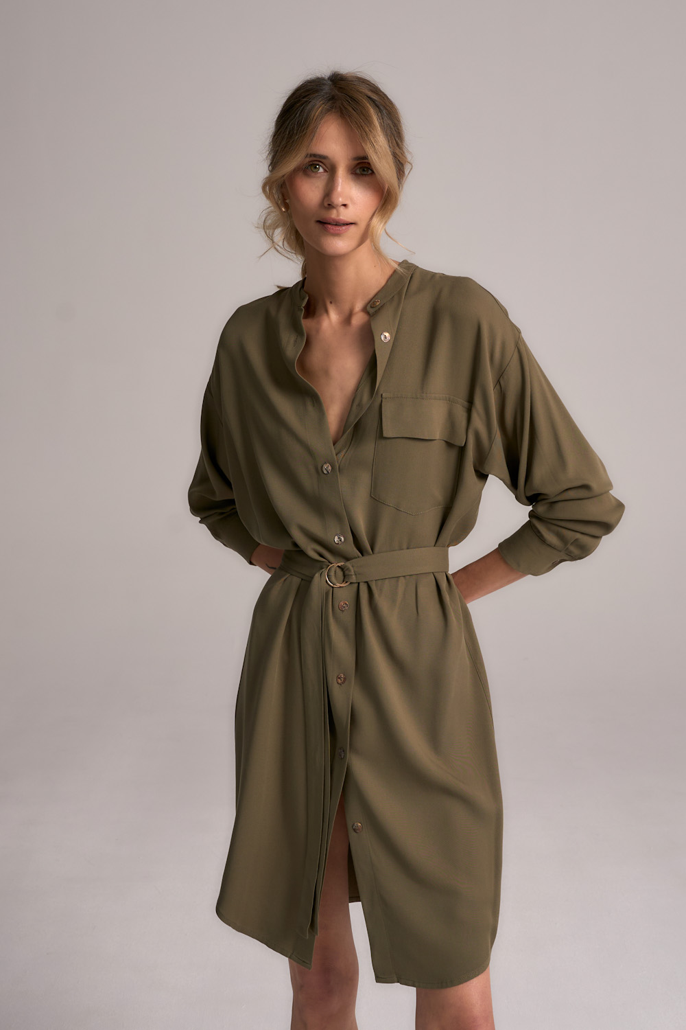 Sukienka koszulowa o prostym kroju, uszyta z naturalnej tkaniny wiskozowej w kolorze zieleni khaki, daje komfort noszenia nawet w upalne dni lata. Dekolt ze stójką, zapinana na guziczki z masy perłowej na całej długości. Na boku asymetryczna kieszonka. Długi rękaw wykończony klasycznym mankietem. Pasek ze złotą sprzączką w komplecie. Luźna, z zaokrąglonym dołem i niewielkimi rozcięciami po bokach. Lekka, w pełni kryjąca tkanina wiskozowa o gęstym splocie z delikatnym naturalnym połyskiem.