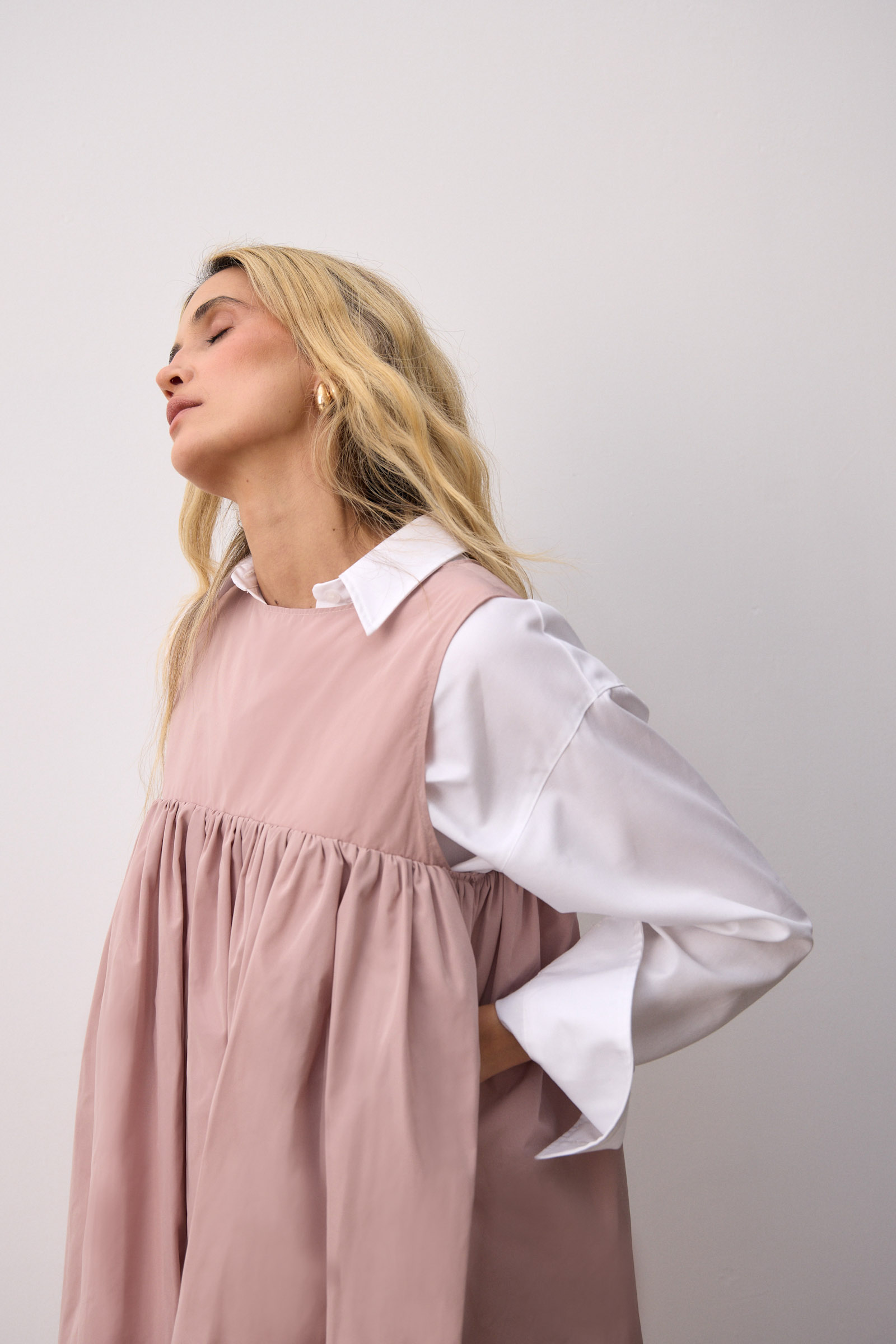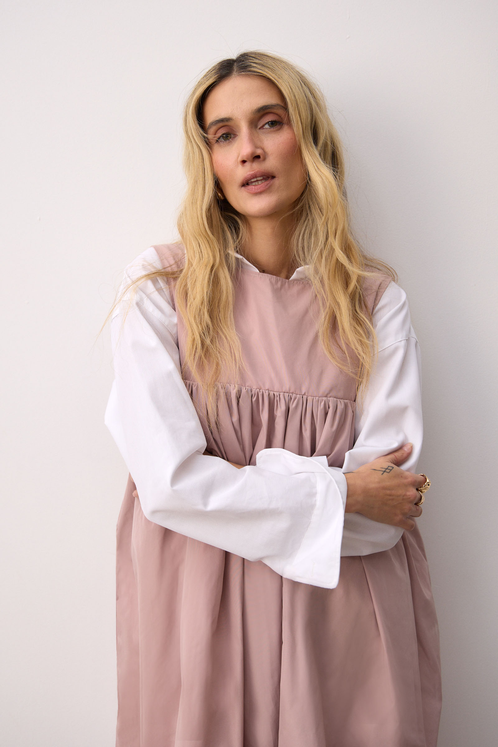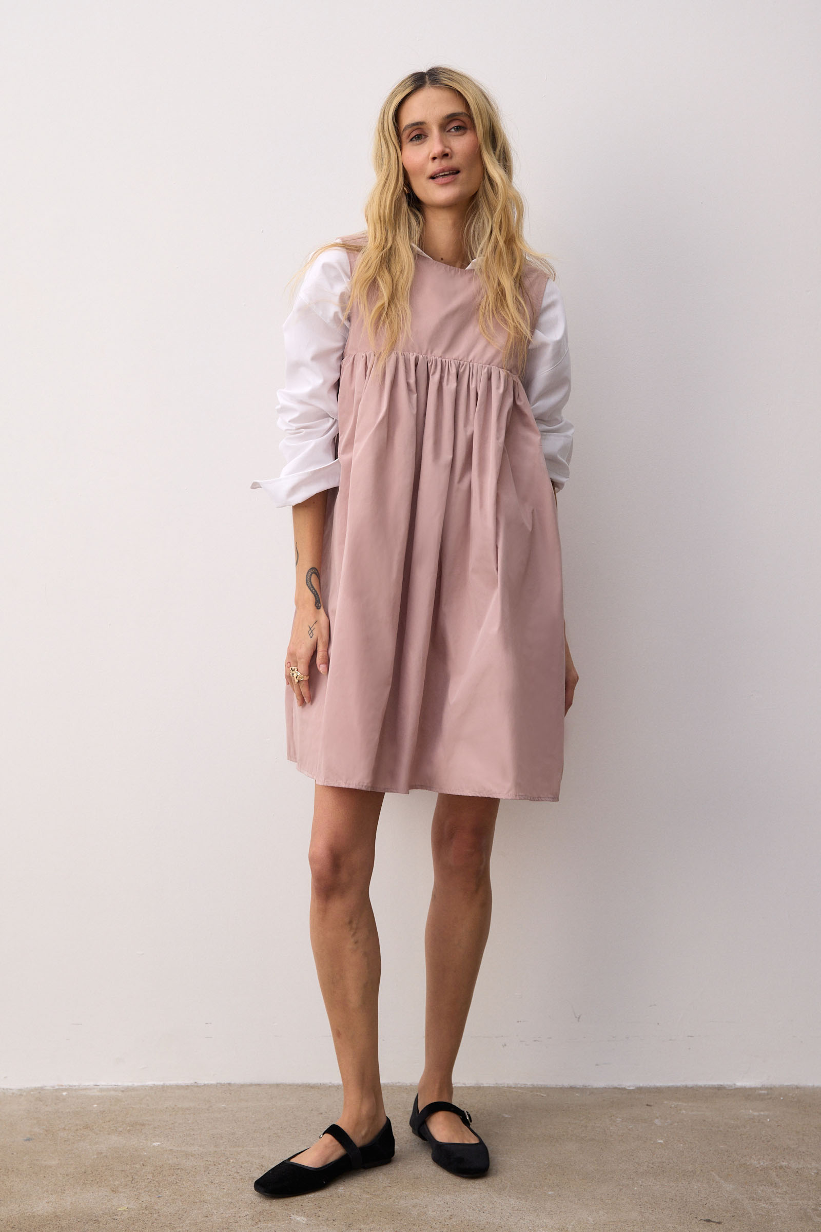Trapezowa sukienka z falbaną uszyta z tafty w kolorze pudrowego różu. Wygodna, niekrępująca ruchów. W szwach bocznych ukryte kieszonki. Z tyłu pęknięcie wiązane aksamitką w tym samym kolorze. Całość na podszewce.