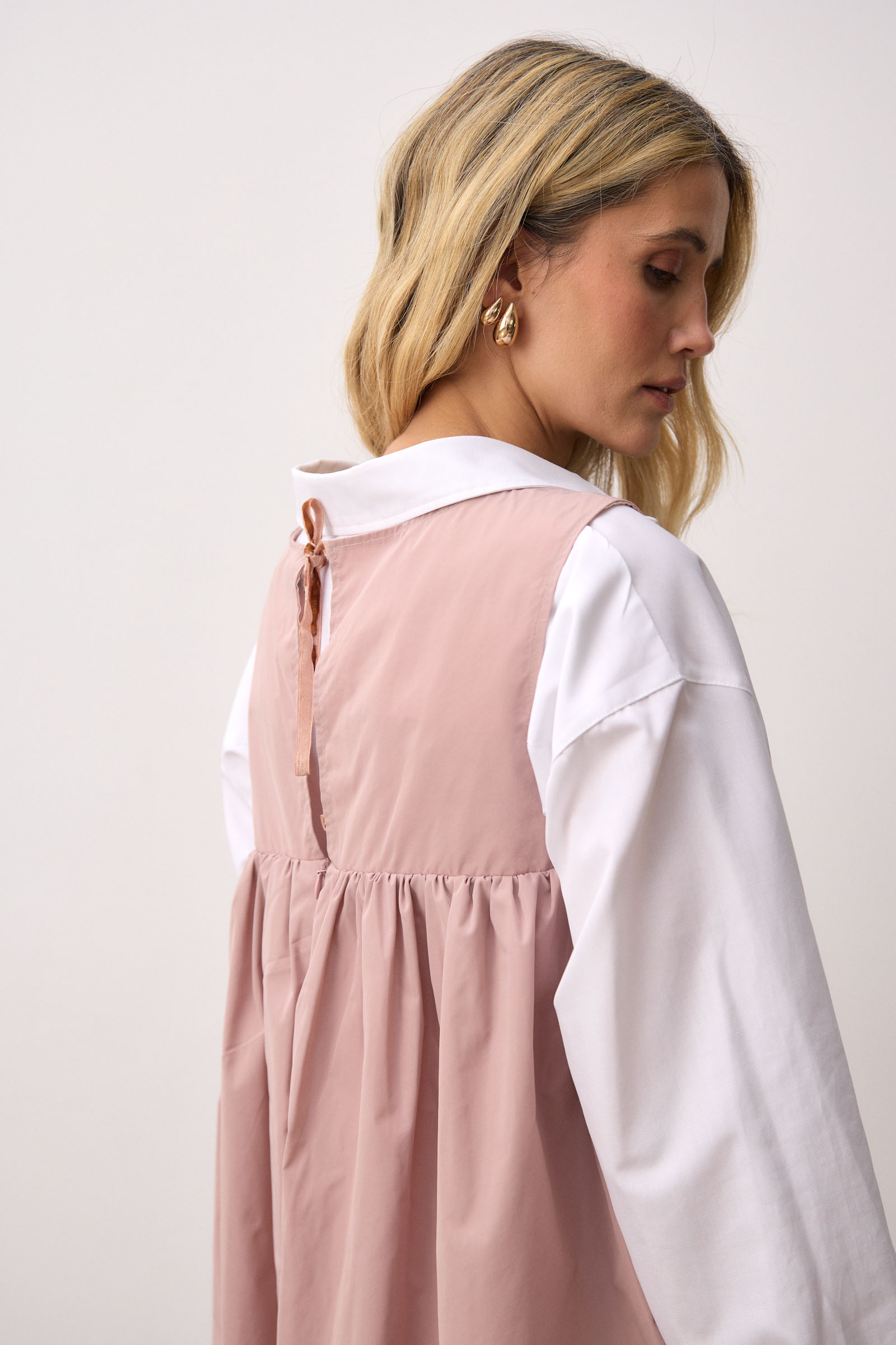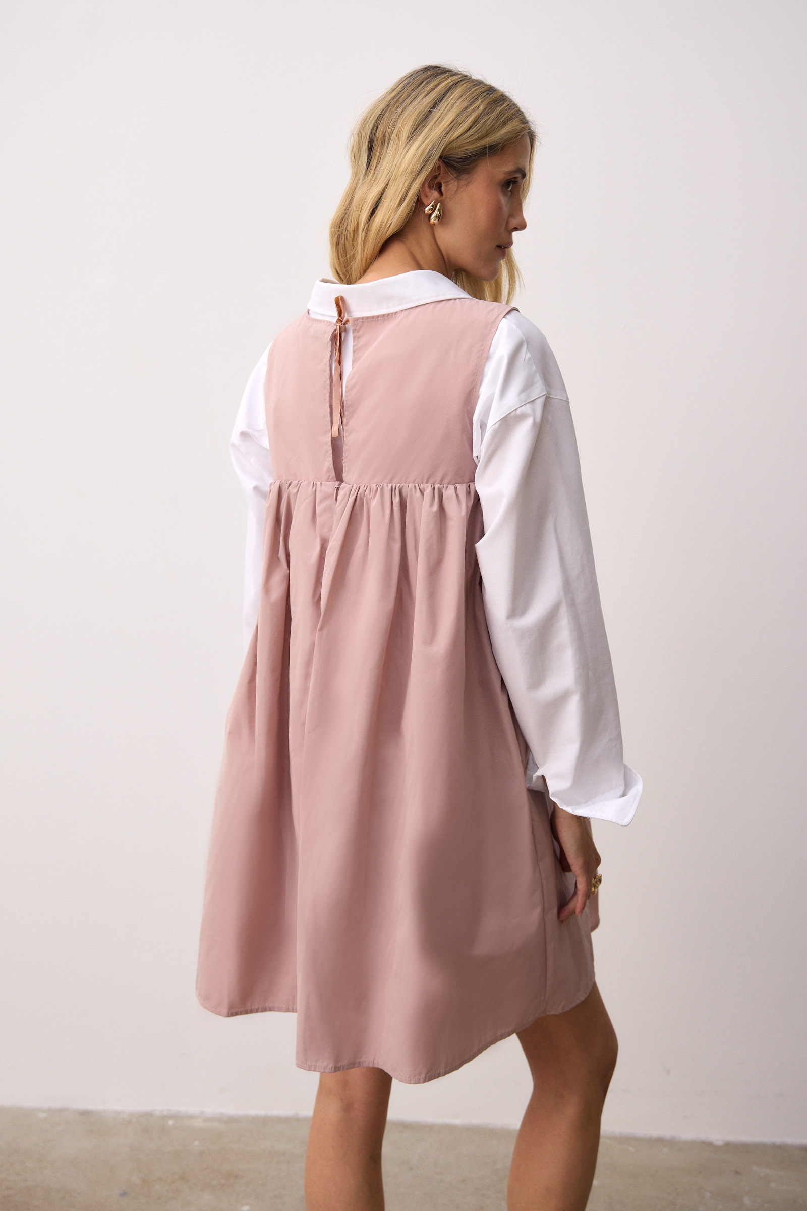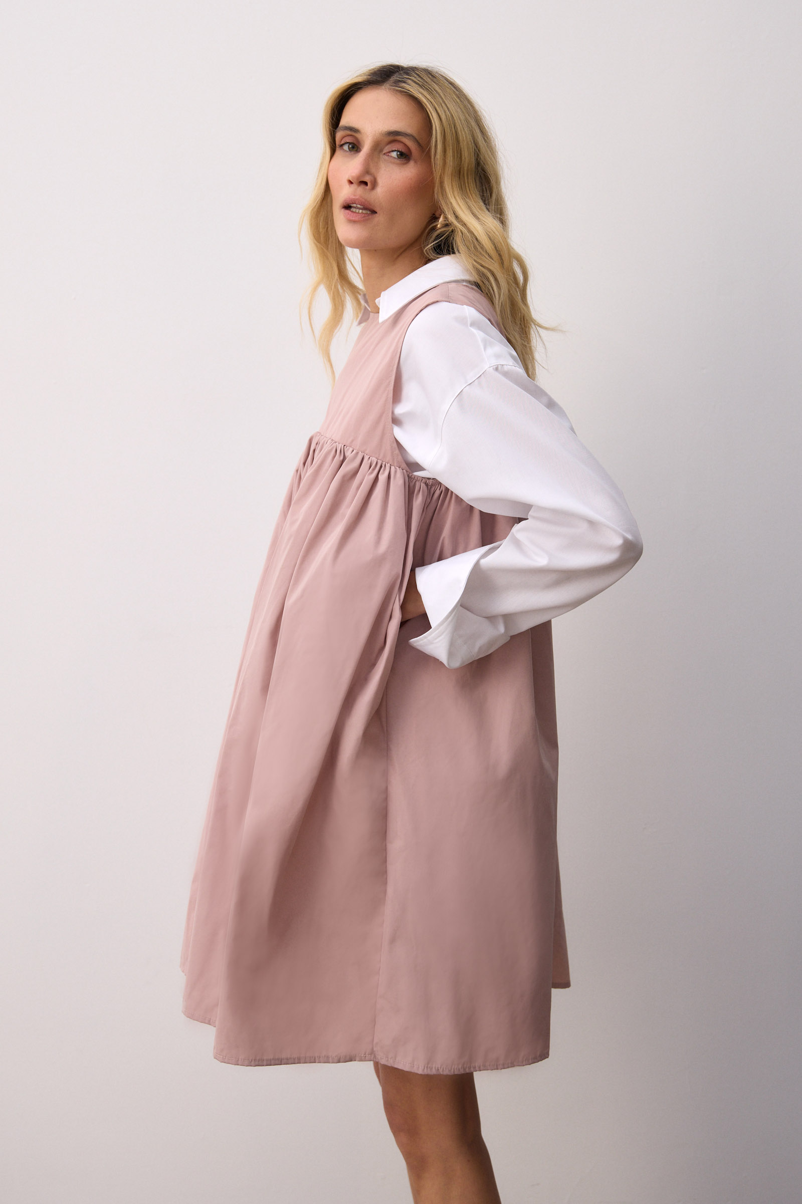 Trapezowa sukienka z falbaną uszyta z tafty w kolorze pudrowego różu. Wygodna, niekrępująca ruchów. W szwach bocznych ukryte kieszonki. Z tyłu pęknięcie wiązane aksamitką w tym samym kolorze. Całość na podszewce.