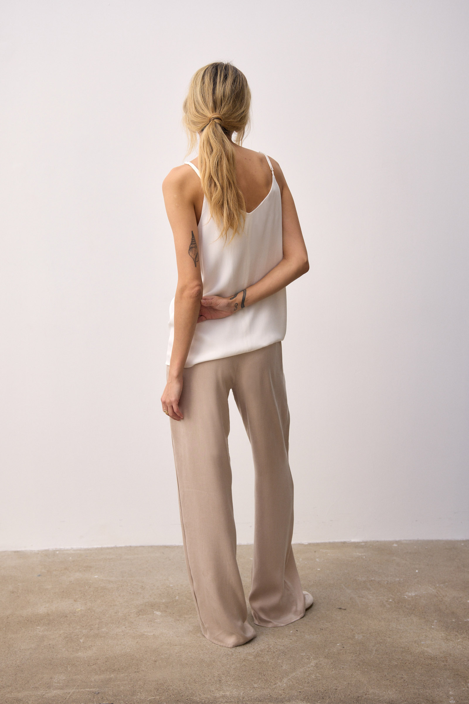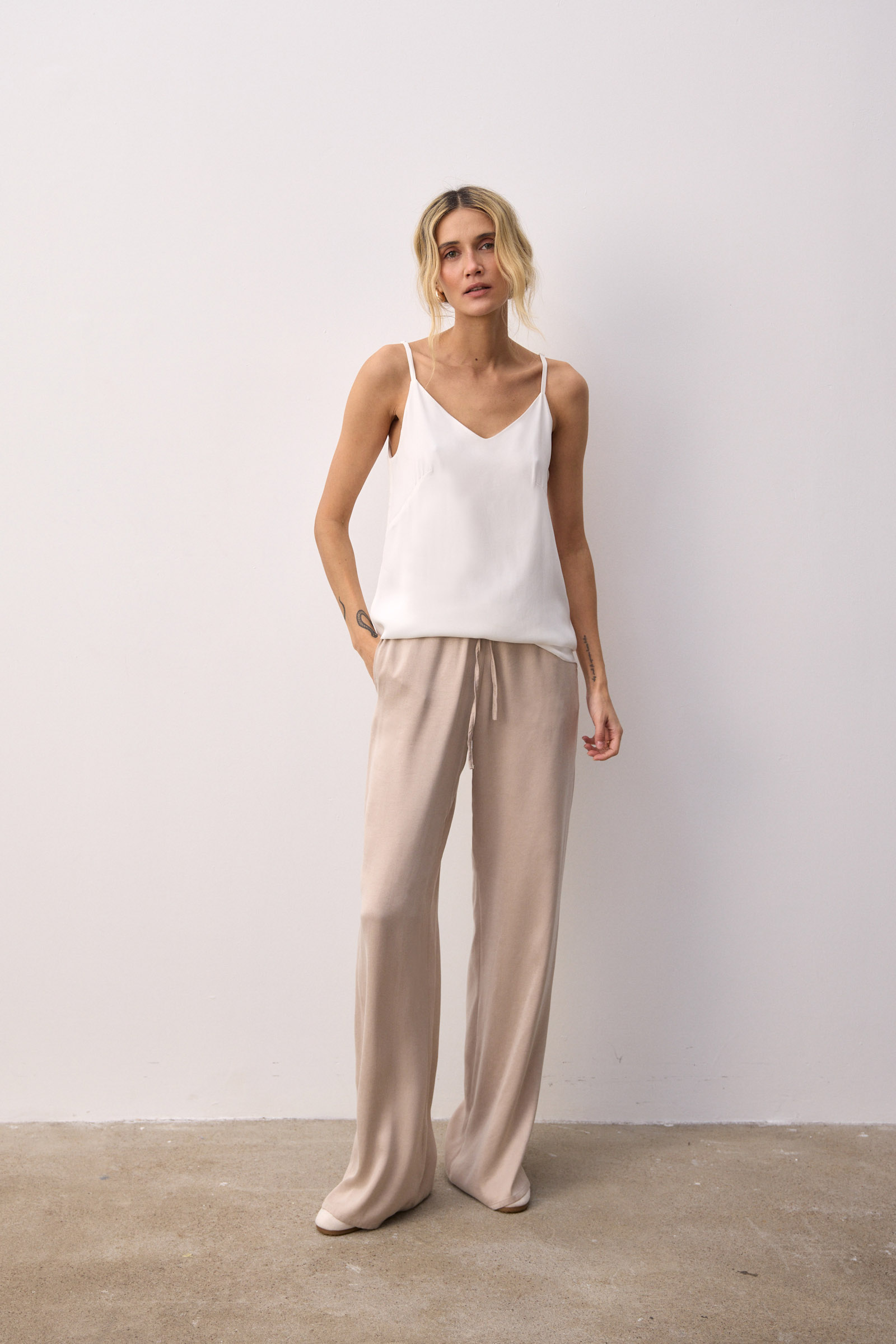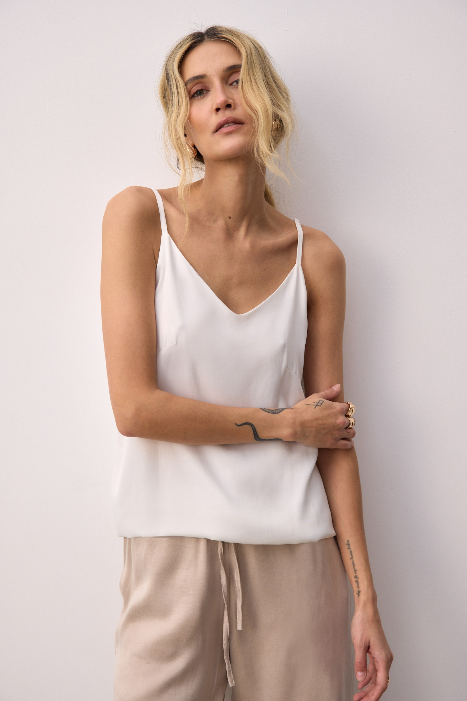 Top na cienkich ramiączkach uszyty z tkaniny satynowej w białym kolorze. Efektowny, głęboki dekolt V z tyłu, z przodu ukośne zaszewki. Prosta forma, lekko poszerzana do dołu. Całość na podszewce z tkaniny żorżetowej zapewniającej pełne krycie.